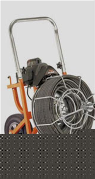 Power is supplied by a 1/3 hp capacitor motor with thermal overload protection and a momentary contact reverse switch. Standard safety features include an air-actuated foot pedal, ground fault circuit interrupter, and safety slip clutch.•Heavy duty machine for clearing tough stoppages and tree roots •Handle folds down and locks for storage/transport •10'' ball bearing wheels mounted on reinforced axle •1/3 HP capacitor motor with thermal overload protection •Safety features include air-actuated foot pedal, ground fault interrupter and safety slip clutch •Flexicore cable has unequalled strength with the right flexibility