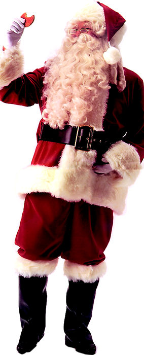 Deluxe Velvet Santa Suit in red velvet with long white plush trim. Suit includes: •Zipper coat w/belt loops & longer coat border •Pants w side pockets •Hat •Naugahyde belt •Naugahyde boot tops w/long fake fur plush trim •White nylon gloves