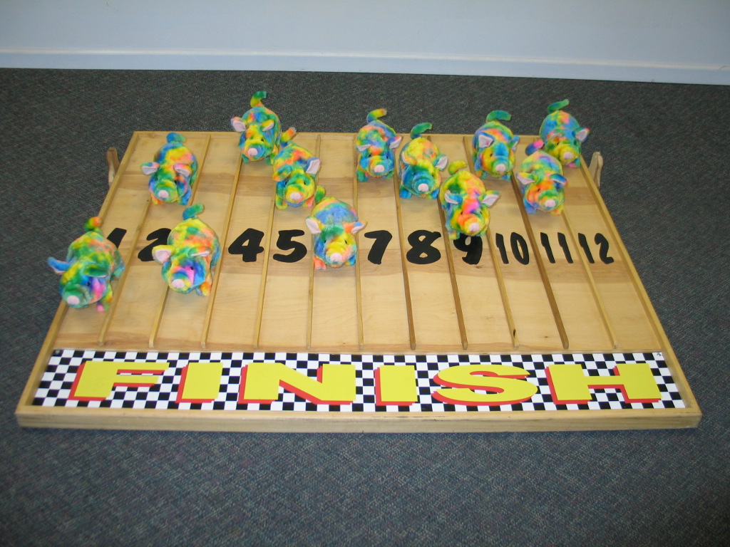 This great group race game provides a lot of excitiment. This board has lanes numbered 1 to 12 and comes with a starting bar. Uses bright multi colored racing pigs that are battery operated. Batteries not included.