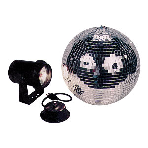 Mirror Ball Set includes 16” mirror ball, 4 1/4” electric motor and spotlight kit. Mirror Ball features tiny mirrored tiles and metal hanger. Motor is battery operated. Comes with 2 spot lights and mounting brackets.